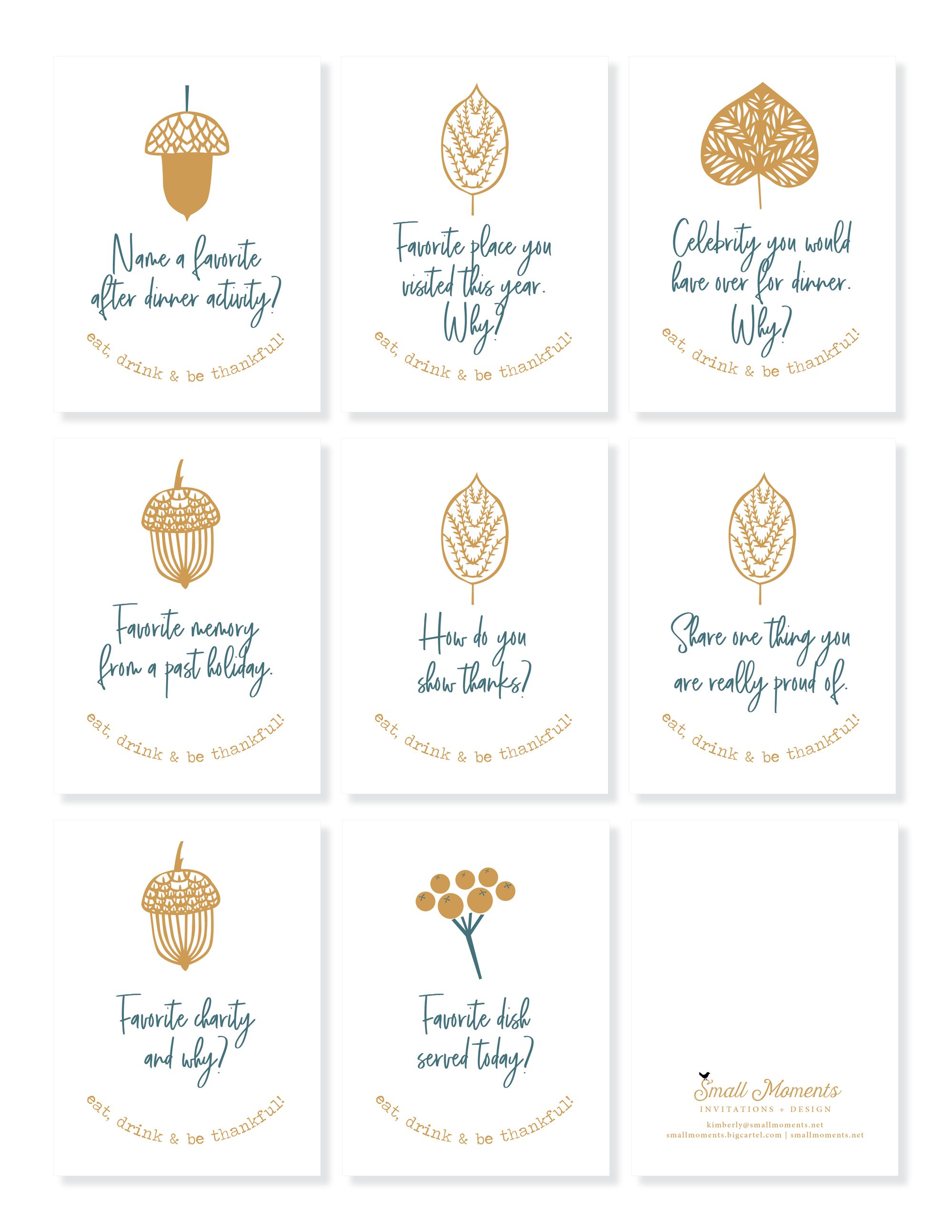 Looking for a fun and thoughtful way to learn about your friends and family at the holidays? These conversation cards are sure to help. Prompt your guests to share their favorite holiday memory, tradition, food and what they're thankful for. I’ll ship three letter size sheets and you can cut out the individual cards.