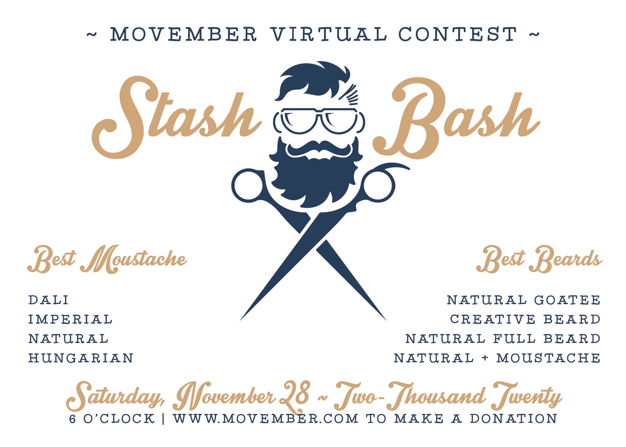 Having a Movember party online? Perhaps a barber/stylist industry event to raise money for Movember in conjunction with men's health awareness? Or a contest to see who's a serious player when it comes to the art of growing facial hair. This invite is the perfect excuse to have that kind of party! I can customize the wording based on what kind of event you're having!
