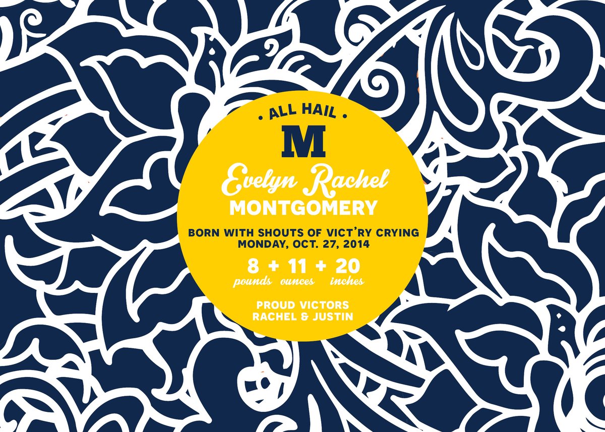 All hail the new baby! If you're a U of M fan/alumni AND a new parent - how can you resist telling your friends and family about your new little "Victor" than with this maize and blue themed baby announcement. I can customize the wording. I could also make this design into a bridal shower or birthday invitation.